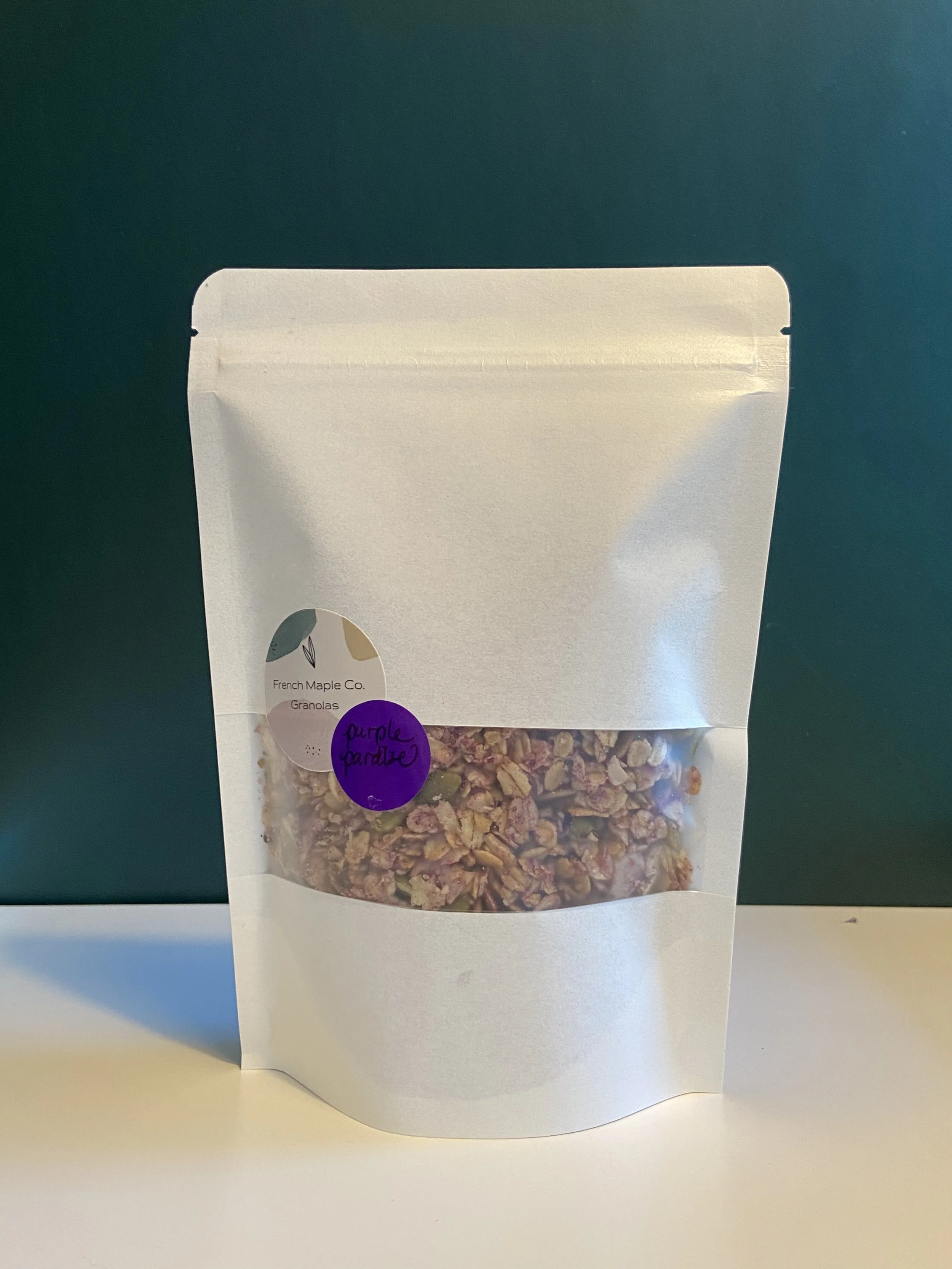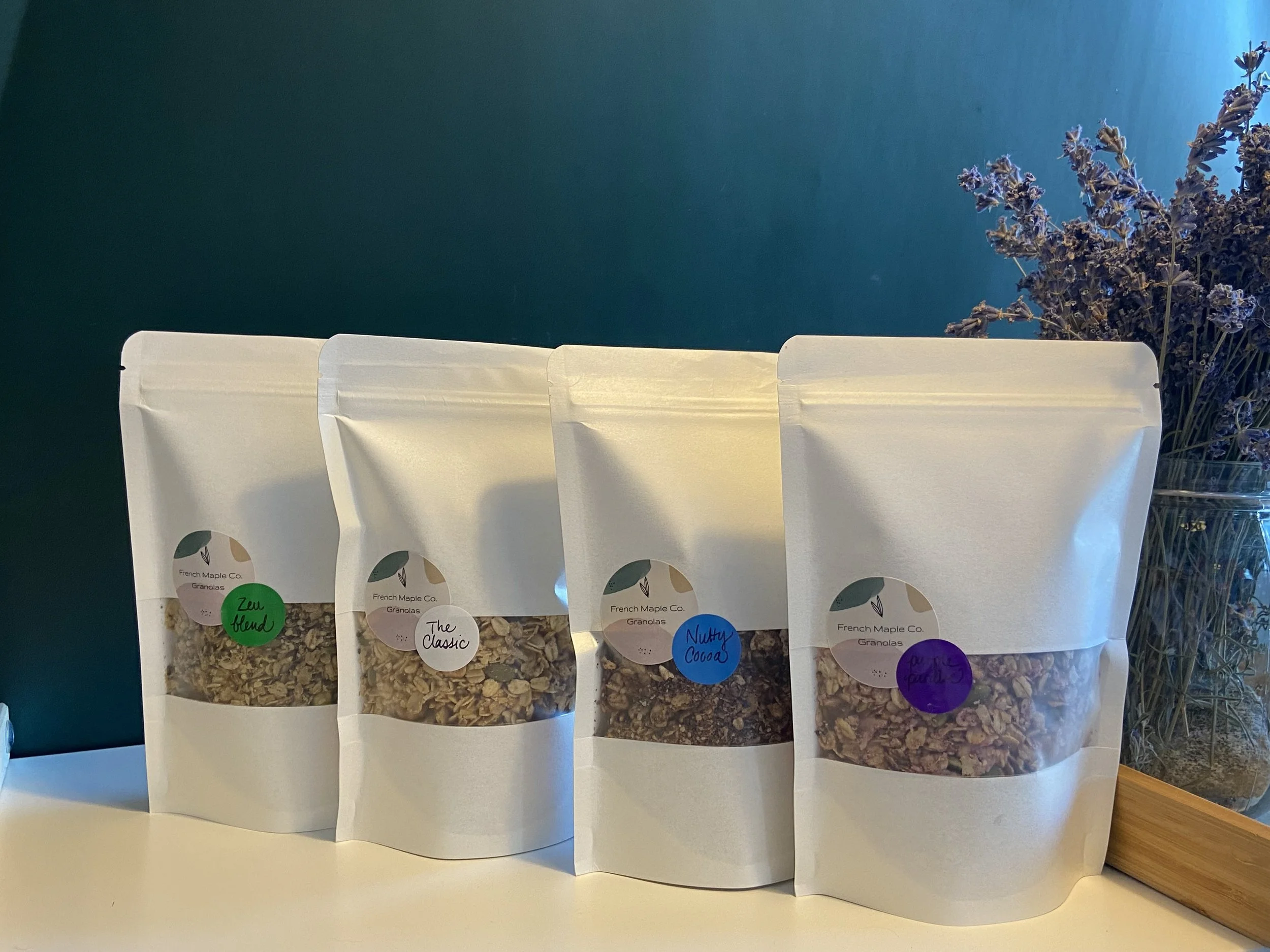 Sample box set from $15.50 Select Size 45g x 4 bags 185g x 4 bags 500g x 4 bags Purchase Added! THE CLASSIC GRANOLA from $9.00 Select Size 185g 500g Purchase Added! NUTTY COCOA (former Cocoa hazelnuts) GRANOLA from $9.00 Select Size 185g 500g Purchase Added! ZEN BLEND GRANOLA from $11.00 Select Size 185g 500g Purchase Added! PURPLE PARADISE GRANOLA from $11.00 Select Size 185g 500g Purchase Added! GRANOLA GIFT CARD from $25.00 Select Value $25.00 $50.00 $75.00 $100.00 Purchase Added!